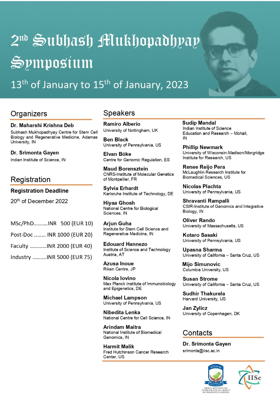 2023年1月13日(金)~15日(日)開催 インド主催の生殖細胞関連のオンライン国際シンポジウム "2nd Subhash Mukhopadhyay Symposium"の案内です。 https://research.adamasuniversity.ac.in/2nd-subhash-mukhopadhyay-symposium/ 井上梓先生が演者として参加されます。 参加登録はこちらから。締切は2022年12月20日です。